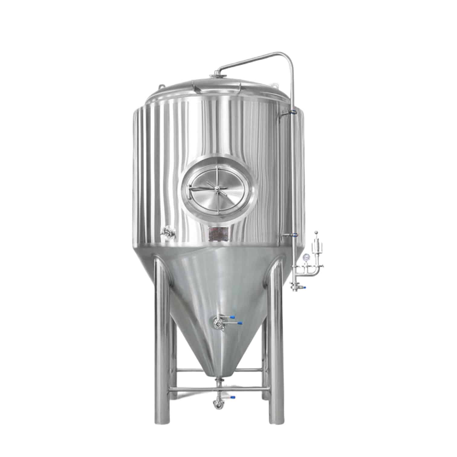 Su cuerpo de doble pared con una camisa de hoyuelos alrededor de los laterales y el cono cubre 1,8 m² de superficie de refrigeración. Cuando se combina con un PLC Siemens o un PID Schneider/ABB, la temperatura se mantiene constante durante el macerado, la fermentación y el acondicionamiento.